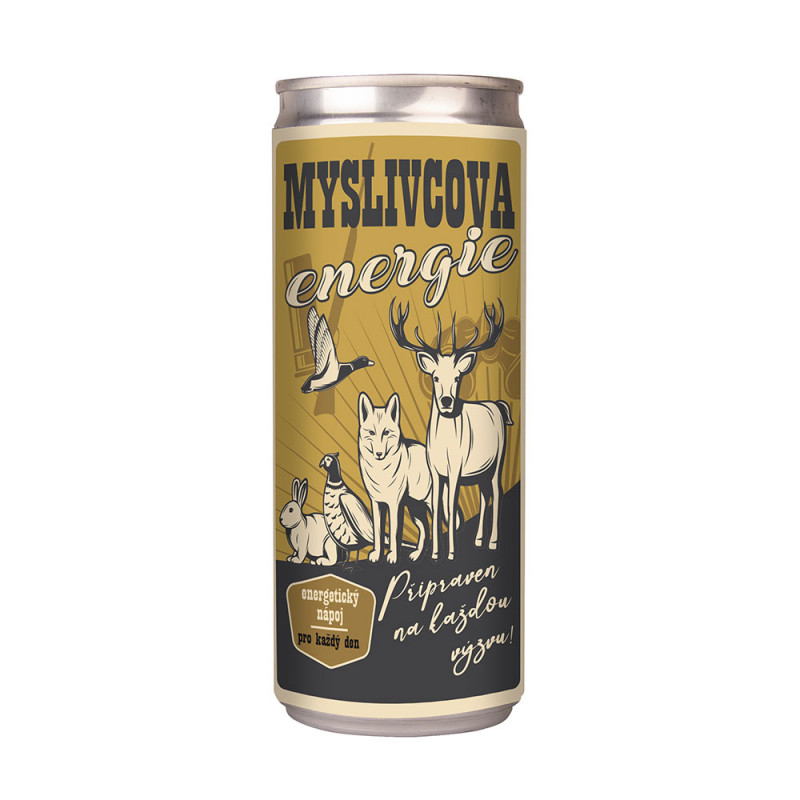 Energetický nápoj pro myslivce - energie pro tvůj lov. Mírně perlivý nealkoholický energetický nápoj obsahující kofein, taurin a vitamíny. Krásný dárek pro myslivce a milovníky přírody plný energie.